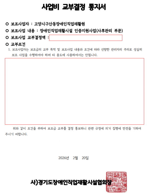 우리 고양시구산동장애인직업재활원에서는 경기도장애인직업재활시설협회에서 진행한 2026년 장애인직업재활시설 인증지원사업(사후관리) 수행시설에 사업계획서를 제출하여 선정되었습니다.